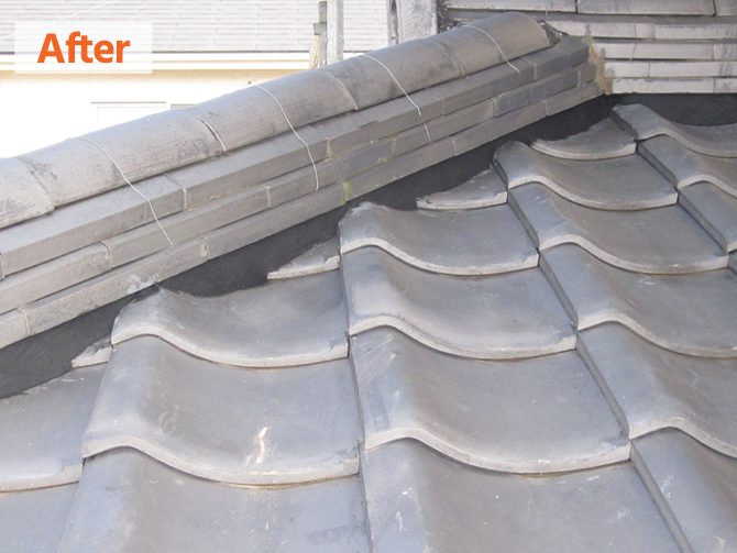 新規漆喰の充填:専用の漆喰材で隙間を埋め直し、瓦の固定力を高めます。