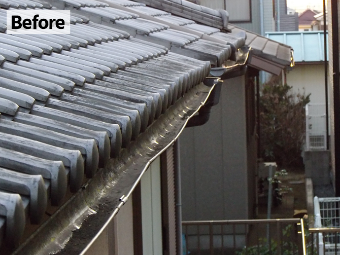 屋根の漆喰部分はひび割れや剥がれが進行しており、雨樋も経年劣化により雨水が適切に流れない状態でした。